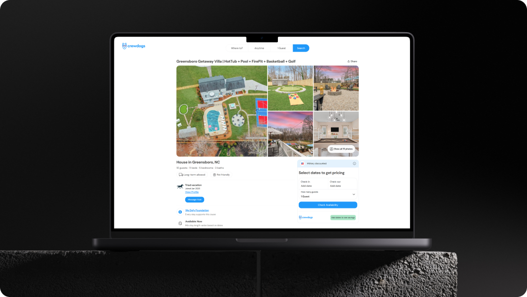 Triad Vacation Rentals has partnered with Crewdogs, a U.S. veteran-founded platform built exclusively for the military community. Every property is ID-verified, every booking supports veteran causes, and military families automatically receive 15-25% discounts.